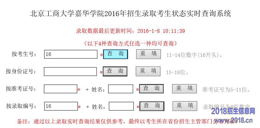 北京工商大学嘉华学院2016年招生录取考生状态实时查询系统备注:通过以上录取实时查询结果仅供参考,最终以考生所在省份招生主管部门公布为准!提示:更多2016各大学录取结果查询系统入口请进入查看:http://www.zspx.cn/news-id-16202.html(2016年各高校录取名单结果查询入口)