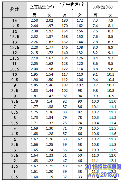 2016淮北中考体育考试评分标准