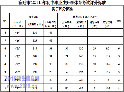 1.宿迁市2016年初中毕业生升学体育考试评分标准