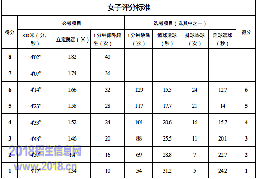 2.考试项目及分值:分为必考项目和选考项目。必考项目为耐久跑(男生1000米跑,女生800米跑)、立定跳远、一分钟仰卧起坐三项,选考项目可从一分钟跳绳、篮球运球、排球垫球、足球运球四项中任选一项。其中男生1000米、女生800米、立定跳远、一分钟仰卧起坐满分均为8分,选考项目满分为6分。