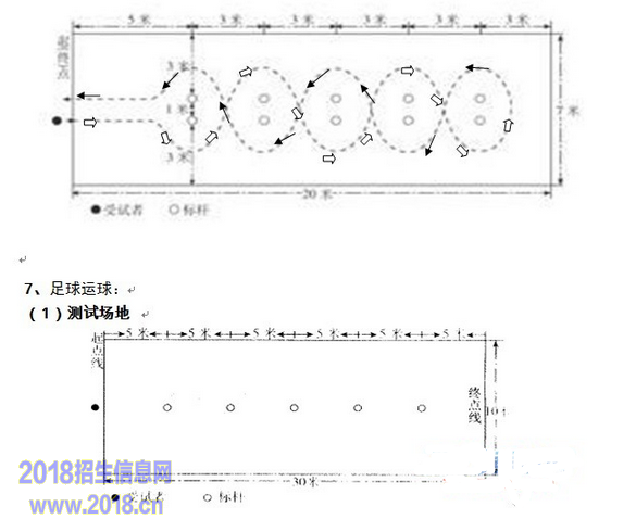 考生站在起点(五个标志杆所形成直线与起点线的垂直处)后准备,听到出发口令后开始用脚(左右脚不限)向前运球,以S型依次绕过杆,不得碰杆。受试者和球均越过终点线即为结束。