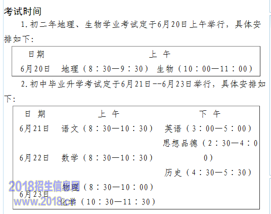 根据省考试大纲,今年我市中考各学科考试形式、分值与去年相同。语文、数学、英语考试时间各120分钟,思想品德、物理考试时间各90分钟,化学、历史、地理、生物考试时间各60分钟。思想品德、历史实行开卷考试,允许考生携带课本和资料进考场。其他学科均实行“闭卷”考试。语文、数学、英语学科卷面分数均为150分,思想品德、历史、物理、化学、地理、生物学科卷面分数均为100分。