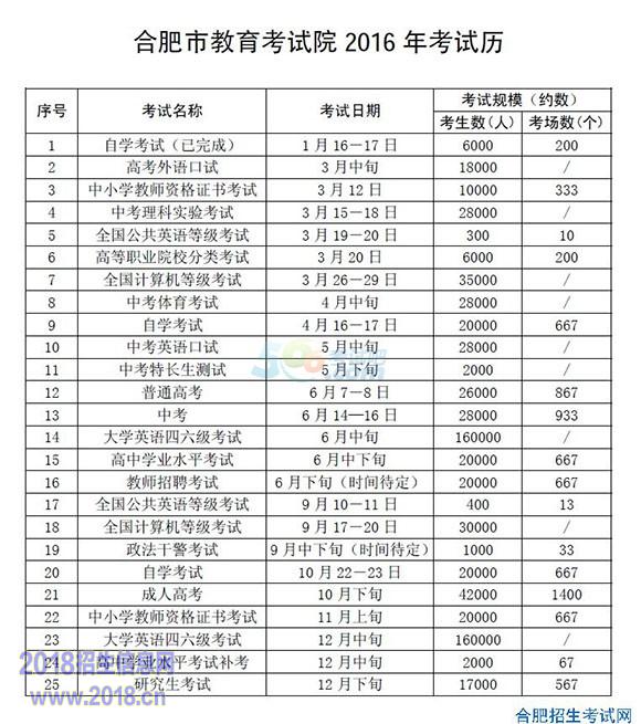 现将《合肥市教育考试院2016年考试历》印发给你们(如有变化另行通知),请据此安排相关工作。承担国家教育考试任务是各类学校应尽的职责和义务,标准化考点学校要主动承担并认真做好普通高考、中考、自学考试、成人高考和研究生入学考试等各类教育考试任务,届时须服从合肥市教育考试院统一安排。