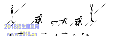 考生测试前直体站立于测试线后,距考生50-60厘米处拉一条可升降的与考生眼睛部位平行的绳或皮筋(见图①),测试时,考生处于俯撑状态时,手与脚不得触碰地面规定的两条平行线(见图③:身高1.59米以下为80公分;身高1.60米以上为90公分);起立后,眼睛部位与悬拉的绳或皮筋处于平行后即为有效完成一次(见图⑤);如俯撑时手或脚触碰地面规定的两条平行线,或起立后眼睛部位明显低于悬拉的绳或皮筋,则判该次无效。每考生有2次测试机会,取其中最好一次成绩。