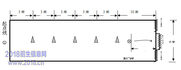 (2)考生站在起点线后准备,听到“开始”(或哨声)口令后(开表计时)向前运球依次过杆,当考生绕过第5个标杆时,在射门线前射门,球过球门线时停表。
