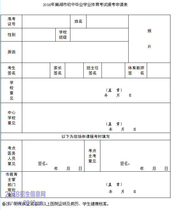 2016年巢湖市初中毕业学业体育考试缓考申请表