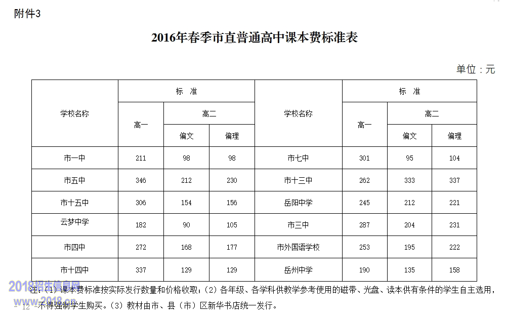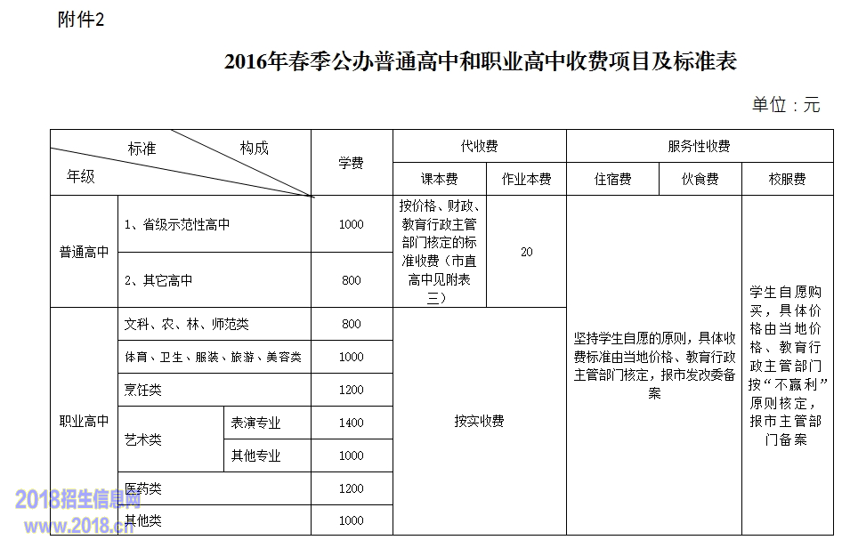 2016年春季,省级示范性高中学费为1000元,其他高中学费为800元。各县(市)区高中课本费委托当地价格、财政、教育行政主管部门严格按照省教育厅颁发的高中用书目录、当地实际征订的版本和省发改委下达的价格分校从实核定,报市发改委、市财政局、市教体局备案。其他服务性收费和代收费,在坚持学生自愿原则的前提下,可向自愿接受相关服务的学生收取教辅材料费、住宿费、伙食费、校服费、就餐卡补办费、校外活动费。