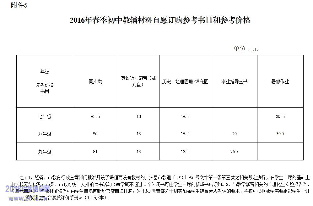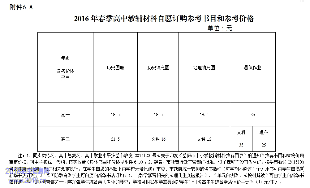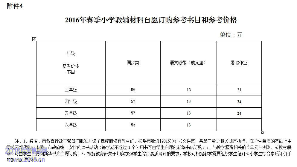 2月18日,岳阳市发展和改革委员会、市财政局、市教育体育局联合下文,正式出台岳阳市2016年春季中小学教育收费标准。文件在确保党和国家在教育方面的惠民政策不折不扣地落实的同时强调,任何部门、单位和个人不得在教辅材料编写、出版、发行等环节,以协助工作为由拿取折扣、索要赞助等方式违规收取费用。义务教育阶段学校代收作业本费最高不超15元