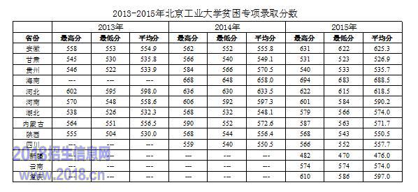 北京工业大学2013-2015年录取分数统计(贫困专项)