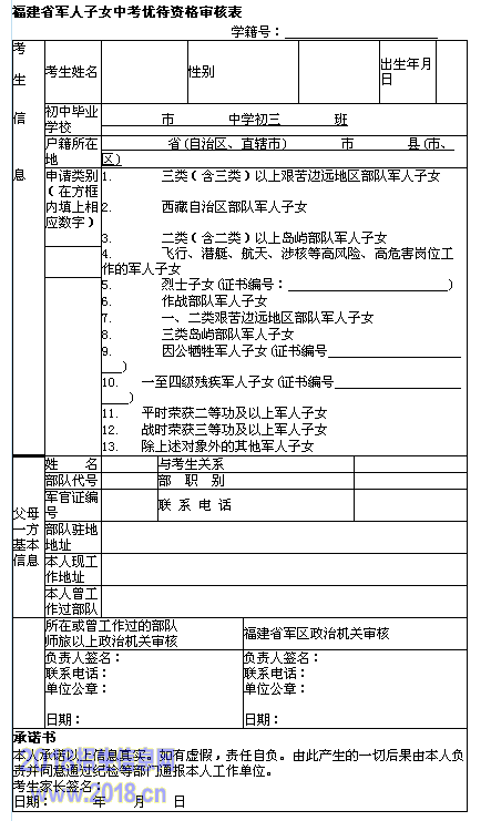 2016福建省军人子女中考优待资格审核表