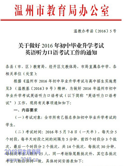 根据《温州市2016年初中毕业升学考试与高中招生实施意见》(温教基〔2016〕9号)精神,为做好2016年温州市初中毕业升学考试英语听力口语考试(以下简称“英语听力口语考试”)工作,现将有关事项通知如下:
