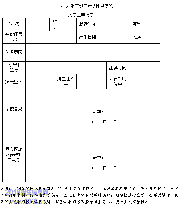 2016绵阳中考体育考试免考生申请表