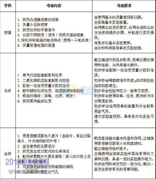 考查采取现场操作、当场打分的方式。考生在进入考场前由考点组织抽签,初二考生从公布的6个生物实验、5个信息技术实践任务中通过抽签选定1个生物实验和1个信息技术实践任务,初三考生从公布的6个物理、6个化学实验中通过抽签各选定1个物理和1个化学实验,并按要求在规定时间内独立完成操作。