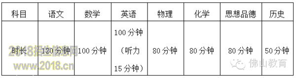 2016年佛山中考各科考试时长: