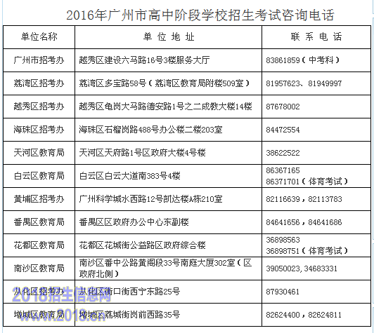 2016广州中考招生各区招考办地址咨询电话