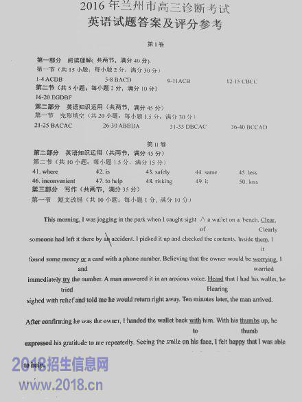 2016年兰州市高三诊断考试英语试题答案