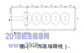 考生在起点线后持球站立,听到出发口令后,按图中所示箭头方向单手运球依次过杆,监考员发令后开表计时,考生与球均返回起终点线时停表。以秒为单位记录成绩,精确到小数点后1位,小数点后第2位数按非零进1原则进位。运球中如球脱手应自行捡回,并在脱手处继续运球,计时不停止。若出现抢跑、双手同时运球、膝盖以下身体部位触球、漏绕标志杆、碰倒标志杆、人或球出考试场地、未按要求路线完成考试的行为,考试成绩无效。每人可考二次,择优记取其中一次成绩。二次考试成绩无效,按7分记取。