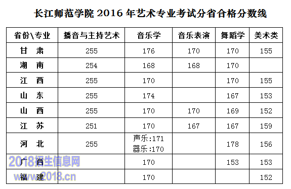 长江师范学院2016年艺术专业考试分省合格分数线