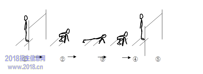 考生测试前直体站立于测试线后,距考生50-60厘米处拉一条可升降的与考生眼睛部位平行的绳或皮筋(见图①),测试时,考生处于俯撑状态时,手与脚不得触碰地面规定的两条平行线(见图③:身高1.59米以下为80公分;身高1.60米以上为90公分);起立后,眼睛部位与悬拉的绳或皮筋处于平行后即为有效完成一次(见图⑤);如俯撑时手或脚触碰地面规定的两条平行线,或起立后眼睛部位明显低于悬拉的绳或皮筋,则判该次无效。每考生有2次测试机会,取其中最好一次成绩。