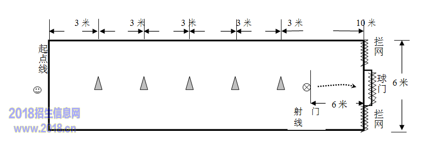 (1)场地器材:在足球场上进行,测试区域长25米,宽6米,起点线至第一杆距离为3米,各杆间距3米,共设5根标志杆,标杆高1.2米,标杆距两侧边线各3米,球门高2米、宽3米,射门线距球门线中点垂直距离为6米,球门立柱两侧圴用高2米、宽1.5米的拦网固定(见测试场地图)。使用4号及以上球若干只(可自备球)。