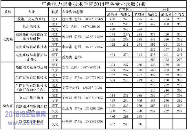 2016广西电力职业技术学院分数线参考:2018招生网整理了历年广西电力职业技术学院录取分数线各省各专业录取分数情况统计