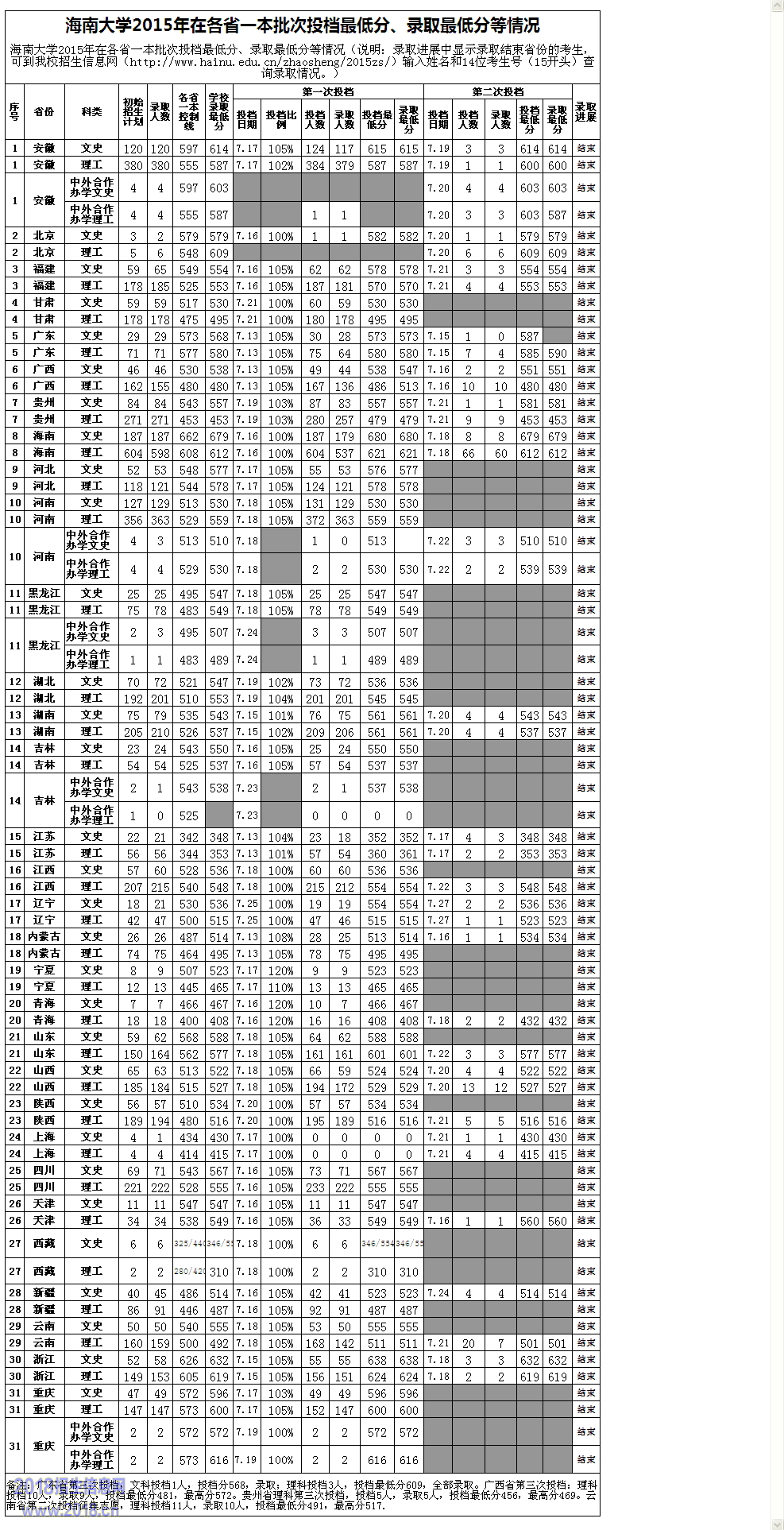 海南大学2015年在各省一本批次投档最低分、录取最低分等情况