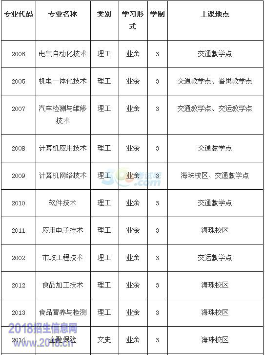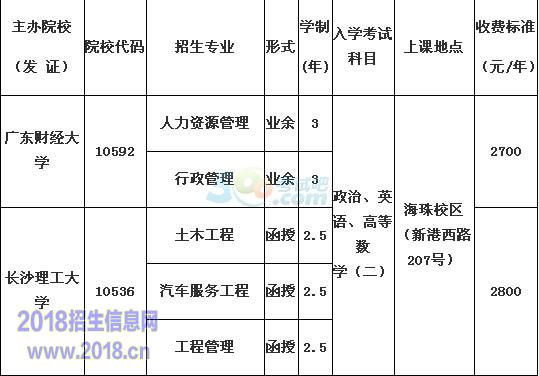 广东财经大学(原广东商学院)、长沙理工大学等省内外高校先后在我院设立成人专升本教学点或函授站,专业包括行政管理、人力资源管理、土木工程、汽车服务工程、工程管理等。