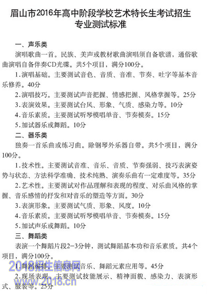 2016眉山中考艺术特长生招生专业测试标准出台