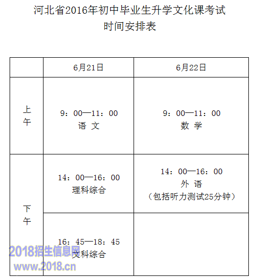 (3)考试时间。全市初中毕业生升学文化科目考试使用同一套试卷,考试时间为2016年6月21日至22日,五个科目考试时限各为120分钟,具体日程见《河北省2016年初中毕业生升学文化课考试时间安排》(见附件2)。
