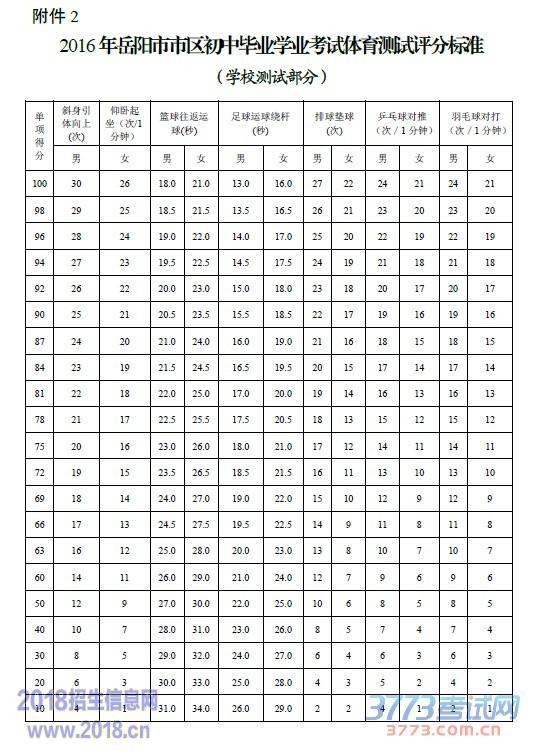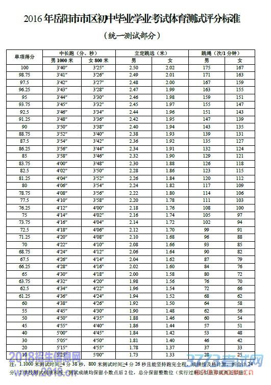 2016岳阳市区初中毕业学业考试体育测试评分标准