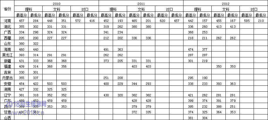近三年各省区录取最高分最低分统计表(2010-2012)