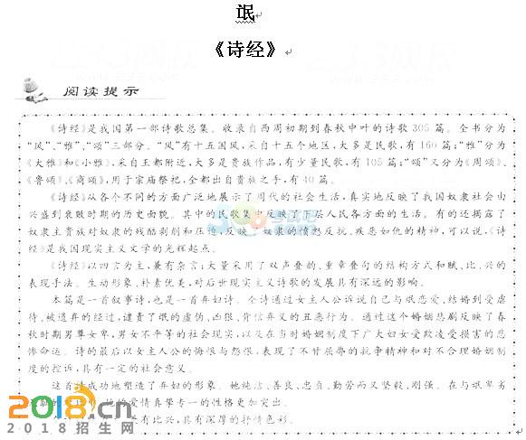 3.《氓》叙述了一个女子的不幸遭遇。诗中通过对女子外嫁三年中早起晚睡的辛劳,横遭丈夫的打骂、兄弟的嘲笑,以及被抛弃后的涉水回家等生活片断的叙述,写出她的悲剧。还通过桑叶的比喻,写女子因操劳而憔悴从而被喜新厌旧的男子休弃的痛苦。通过她的不幸遭遇,再现了春秋时期下层妇女的可悲命运,显示了男女社会地位的不平等,在客观上揭露和控诉了那个历史时代社会制度的不合理。