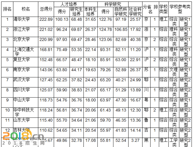 1993年,在武书连发布的我国第1个具有综合意义的大学排行榜中,北京大学获得综合实力第1名。1997年至2010年,清华大学连续14年 获得综合实力第1名;2011至2013年,浙江大学连续3年第1名;2014、2015年,北京大学连续2年第1名。2016年,清华大学夺回综合实力 第1名。2016年前10名分别是:清华大学以222.89分获得第1名,浙江大学以221.02分取得第2名,北京大学以220.99分屈居第3名。获 得第4名到第10名的大学依次是:第4名上海交通大学、第5名复旦大学、第6名南京大学、第7名武汉大学、第8名四川大学、第9名中山大学、第10名华中 科技大学。