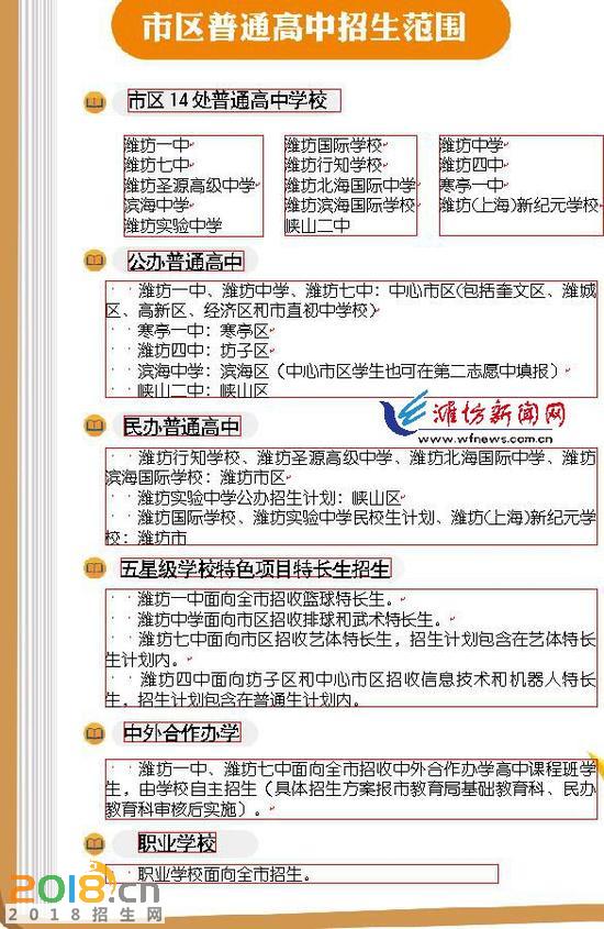 普通高中志愿中,中心市区、峡山区的普通高中志愿共设三个,分别为第一志愿、第二志愿、第三志愿。考生可以最多填报两个公办普通高中志愿和一个 民办普通高中志愿(第一志愿和第二志愿,每个志愿可以填报一个公办普通高中志愿;第三志愿填报一个民办普通高中志愿),或者只填报一个民办普通高中志愿 (第一志愿直接填报一个民办普通高中志愿,其它两个志愿不再填报)。寒亭区、坊子区和滨海区,普通高中志愿共设两个,分别为第一志愿和第二志愿,考生可以 分别填报一个公办普通高中志愿和一个民办普通高中志愿(第一志愿填报公办普通高中志愿,第二志愿填报民办普通高中志愿),或者只填报一个民办普通高中志愿 (第一志愿直接填报民办普通高中志愿,第二志愿不再填报)。