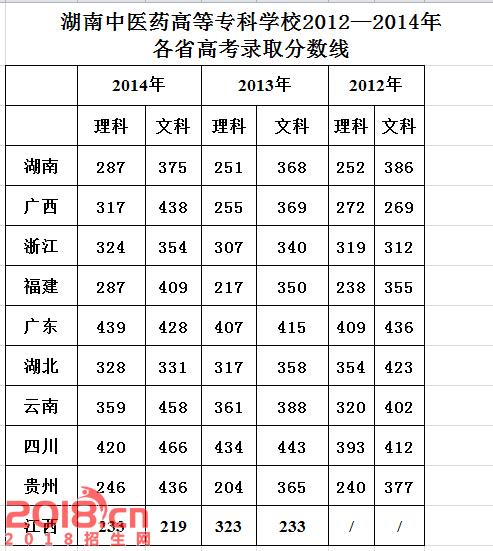 湖南中医药高等专科学校2012—2014年各省高考录取分数线