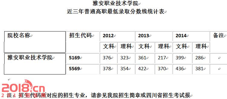 2016雅安职业技术学院分数线参考:2018招生网整理了雅安职业技术学院2015年录取分数线各省各专业录取分数情况统计