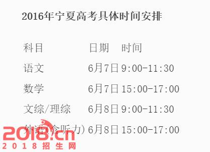 宁夏2016高考时间表及科目
