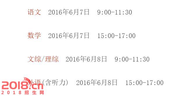 安徽2016高考时间表及科目考试时间日程安排详情: