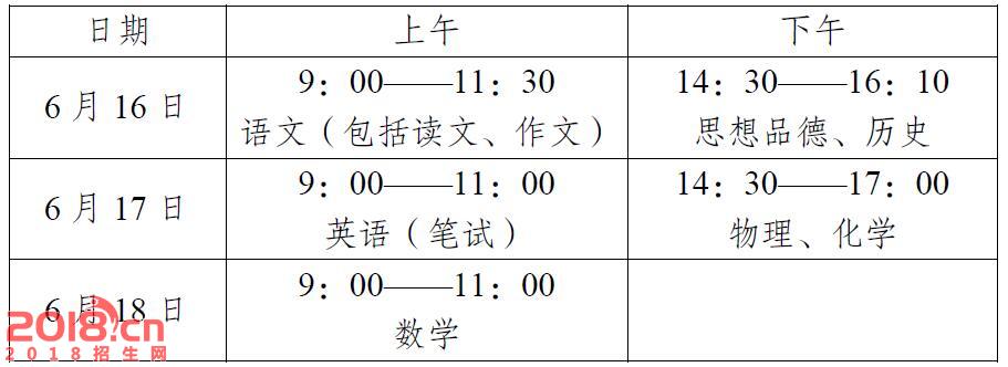文化科目考试日期定于6月16日、17日、18日三天。考试用时:语文150分钟,数学120分钟,英语120分钟,物理与化学150分钟,思想品德与历史100分钟。具体安排如下: