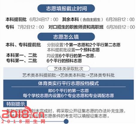 高考志愿(不含艺术、体育类专业)安排在通知考生成绩之后填报,其中本科提前批志愿填报截止时间为6月24日17∶00,其余本科志愿(含自主招生志愿)填报截止时间为6月28日12∶00,专科志愿在7月2日12∶00前完成填报。对口招生的职教师资和高职班志愿均在6月28日12∶00前完成填报。