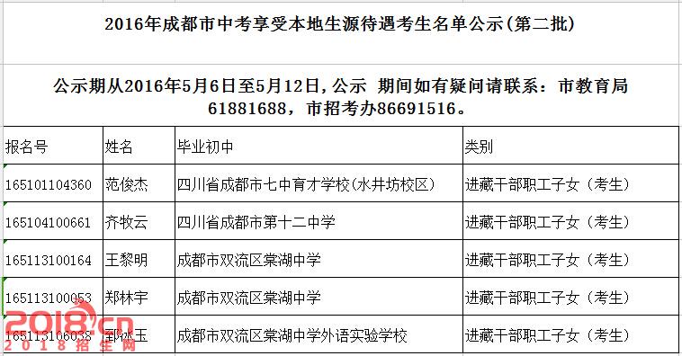 2016成都中考第二批享受本地生源待遇考生名单公示