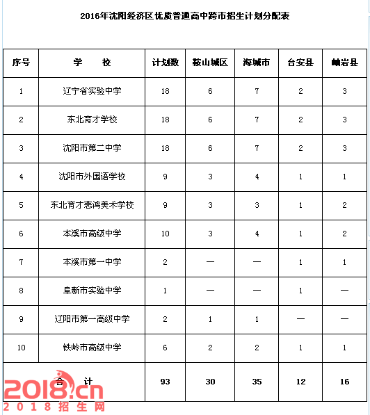 2016沈阳经济区高中跨市招生计划分配表出炉