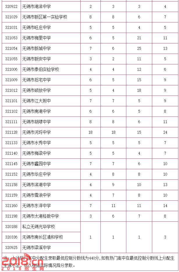 2015年热门高中(不含锡山区、惠山区)分配生录取最低控制分数线为440分,享受分配指标的考生考分应不低于这个分数。如有热门高中在最低控制分数线上分配生生源不足,可以根据实际情况降分录取。