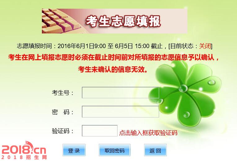 志愿填报时间:2016年6月1日9:00 至 6月5日 15:00 截止,[目前状态:关闭]考生在网上填报志愿时必须在截止时间前对所填报的志愿信息予以确认,考生未确认的信息无效。