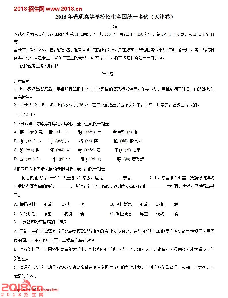 2016年天津高考语文考试时间安排在6月7日上午进行,2018招生网将在第一时间发布2016天津高考语文试题真题、天津高考语文试卷答案、天津高考语文作文题目解析信息,敬请关注!