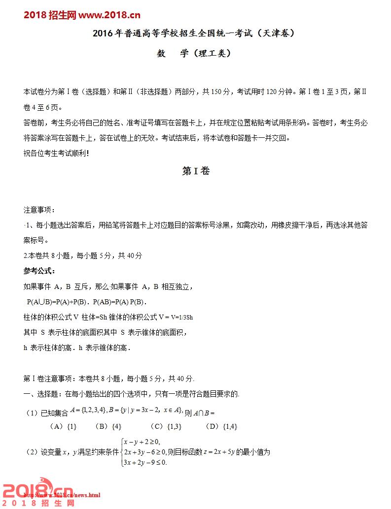 2016天津高考数学试卷及答案下载。2018招生网将在考后第一时间发布2016天津高考数学试题真题word版下载、天津高考数学试卷答案图片版,敬请关注!