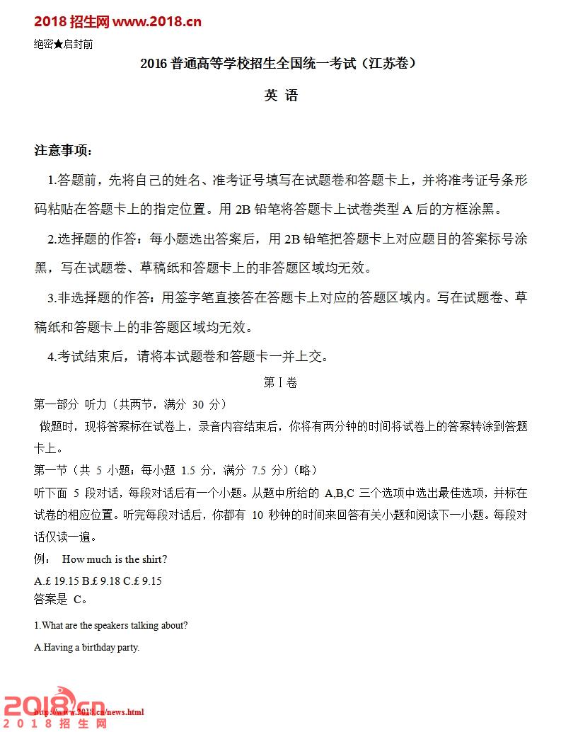2016江苏高考英语真题及答案下载。2018招生网将在考后第一时间发布2016江苏高考英语试题真题word版下载、江苏高考英语试卷答案图片版,敬请关注!