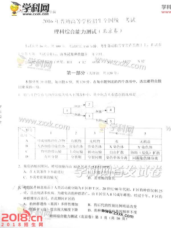 2016北京高考理综试卷及答案下载。2016北京高考理综试题真题word版下载、北京高考理综试卷答案图片版,敬请关注!