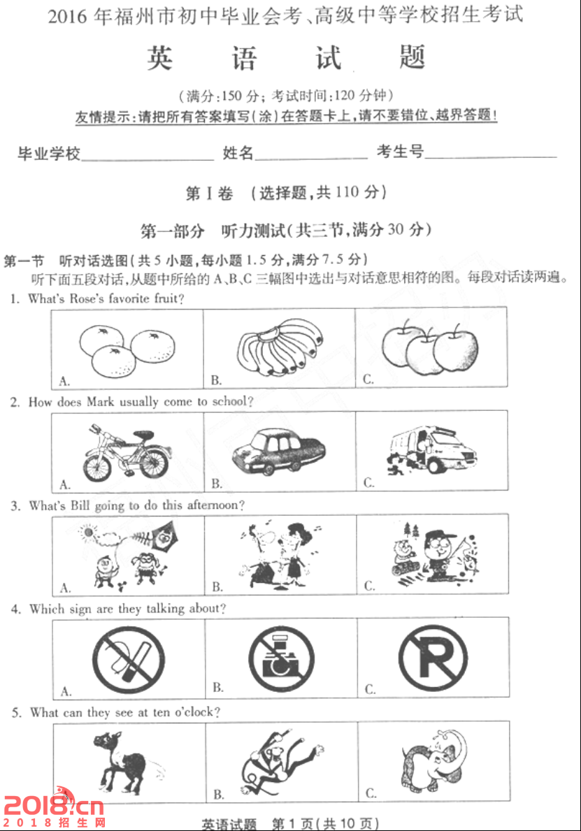 2016年福州市中考英语试卷及参考答案 完整版下载