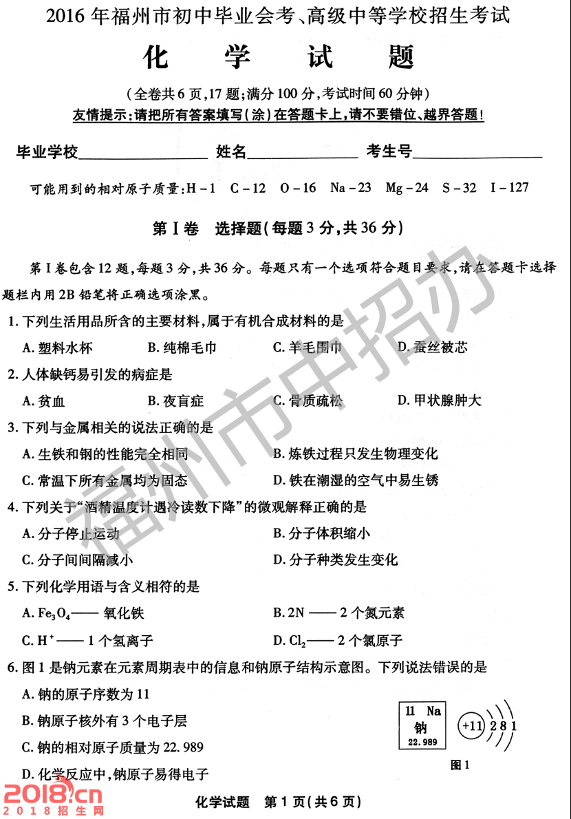 2016年福州市初中毕业会考、高级中等学校招生考试化学试题及参考答案